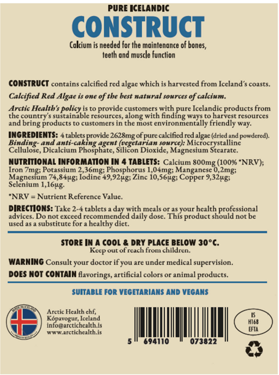 Ingredients: 4 tablets provide 2628mg of pure calcified red algae (dried and powdered).